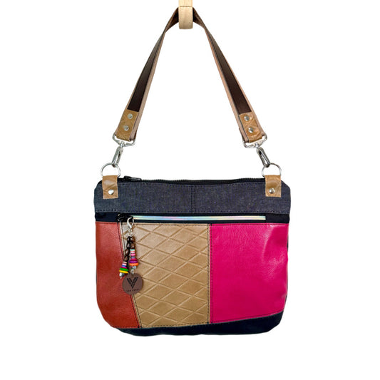 Brown Leather & Red Denim Crossbody