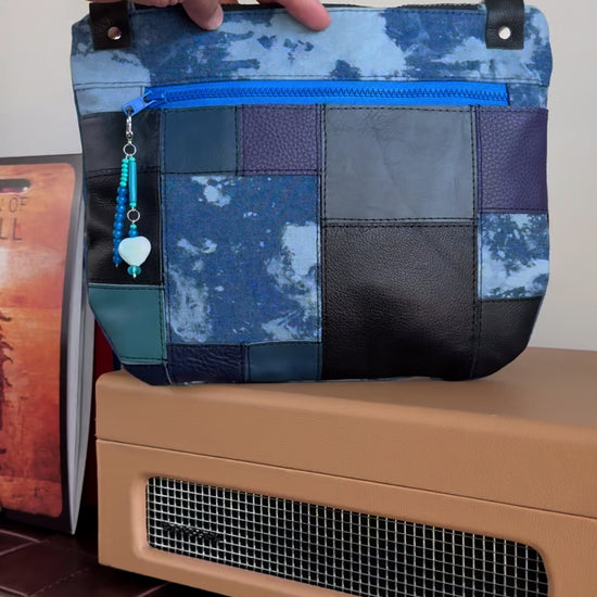 This bag was made using multiple shades of blue and black authentic cowhide leather and accented with blue denim. The denim was bleached to add even more dimension to the patchwork style. This crossbody is also fully lined and comes with a removable crossbody strap and a leather trimmed shoulder strap.