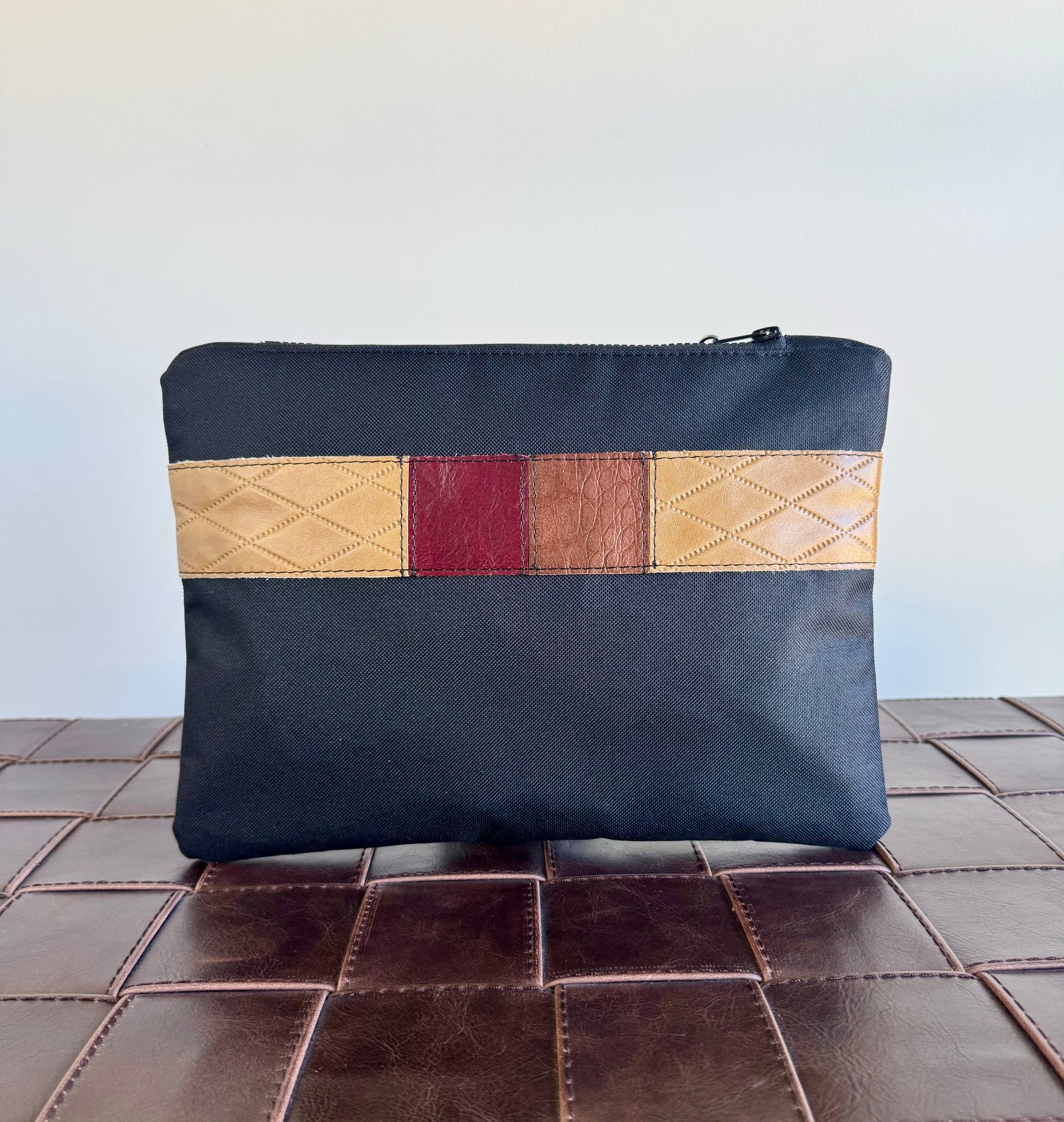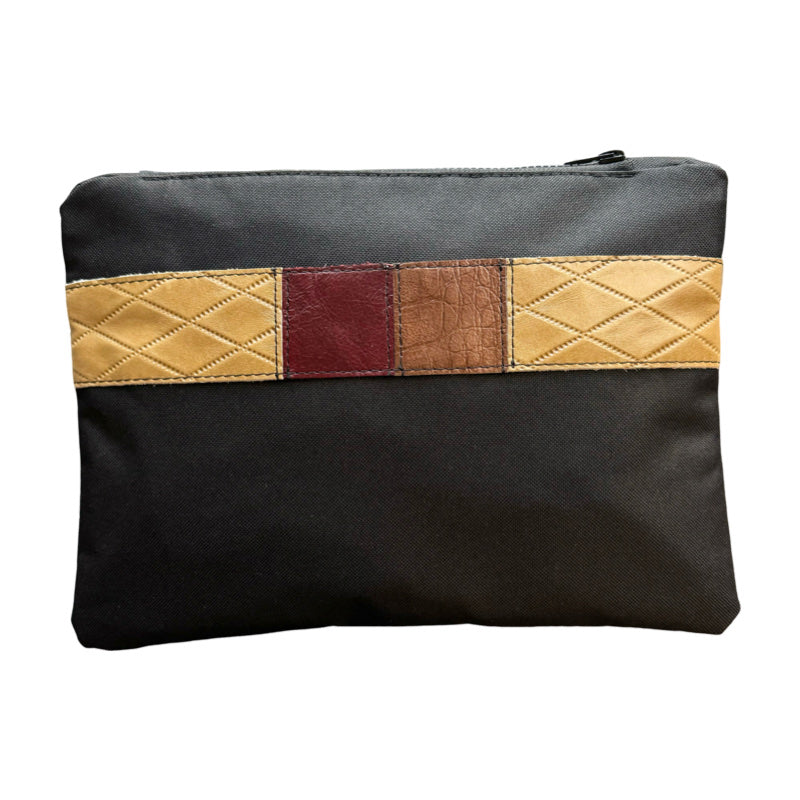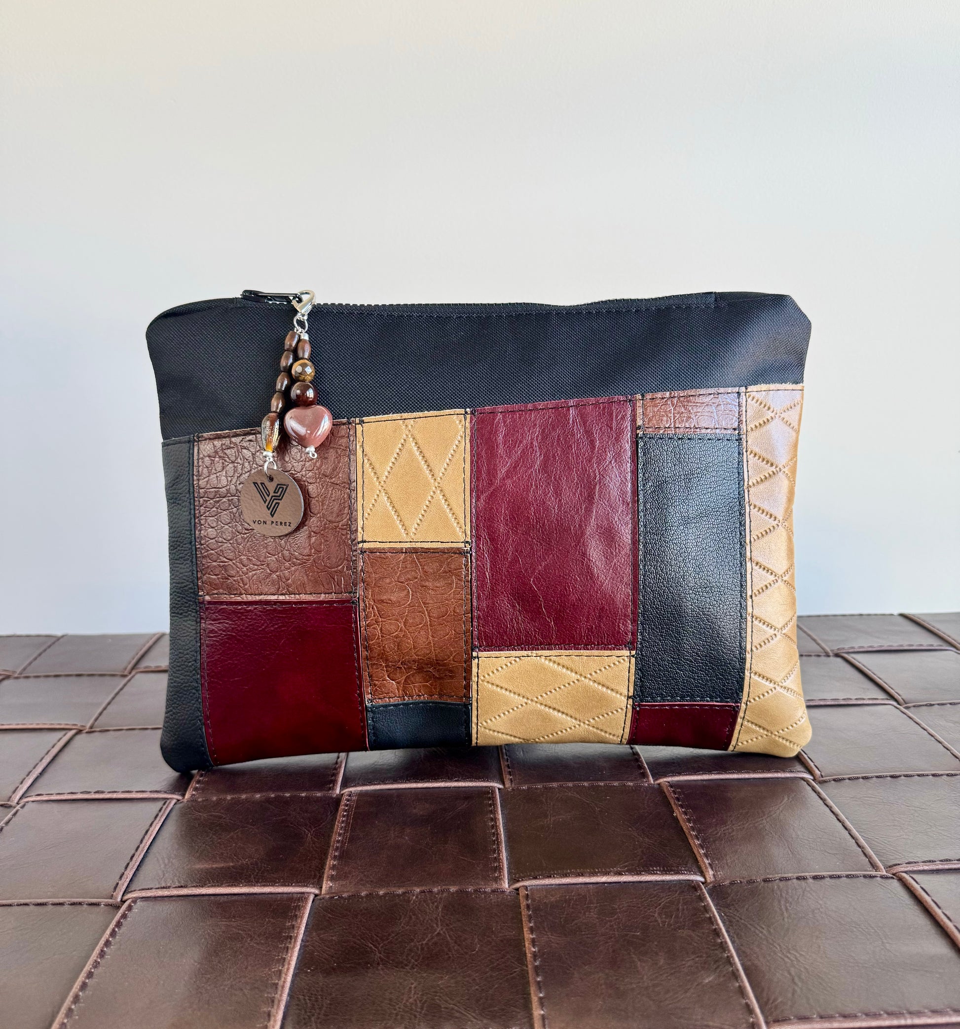 This clutch is a true work of art. It blends premium leather with stain resistant coated canvas in a vibrant design. The standout feature is its asymmetrical leather patchwork front—an unmistakable Von Perez signature that embodies individuality and craftsmanship.