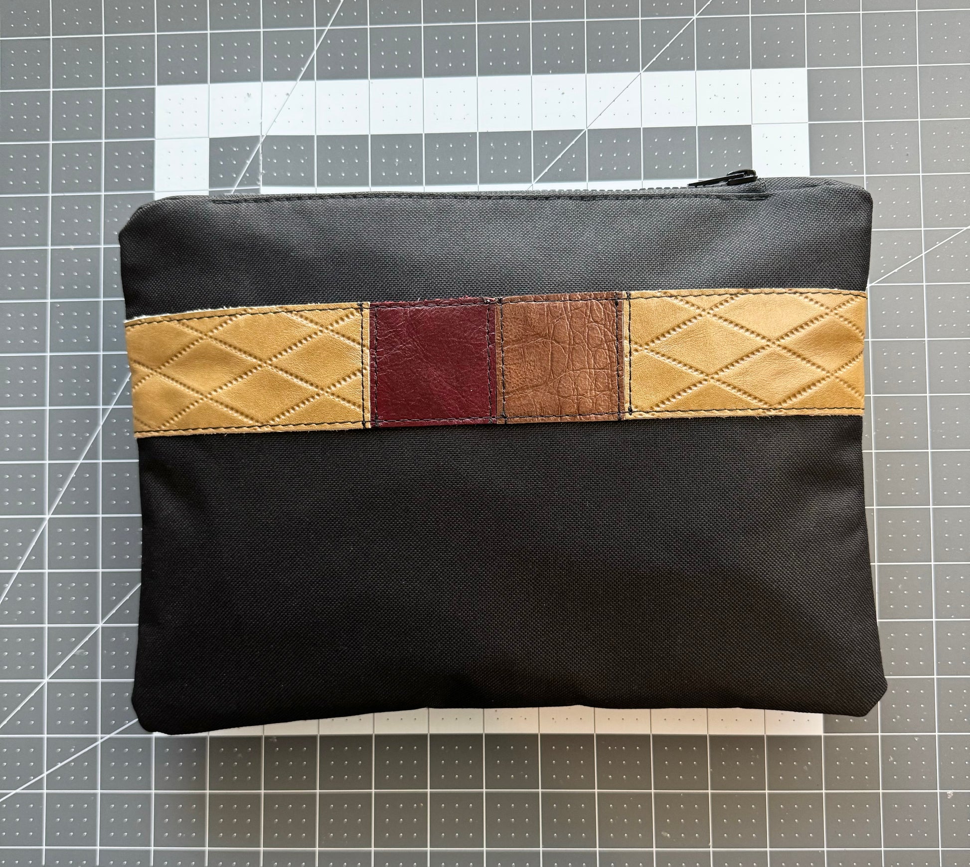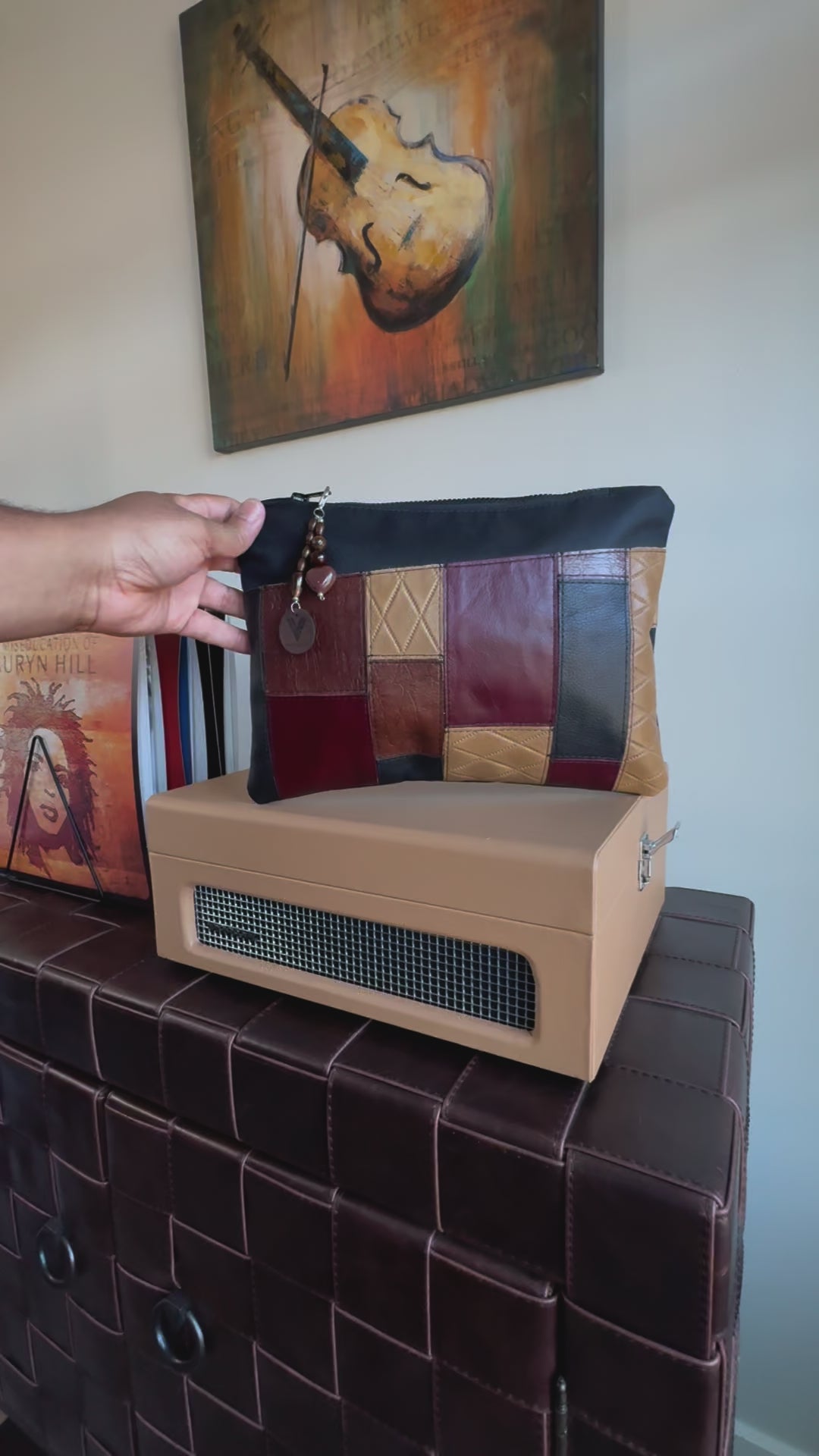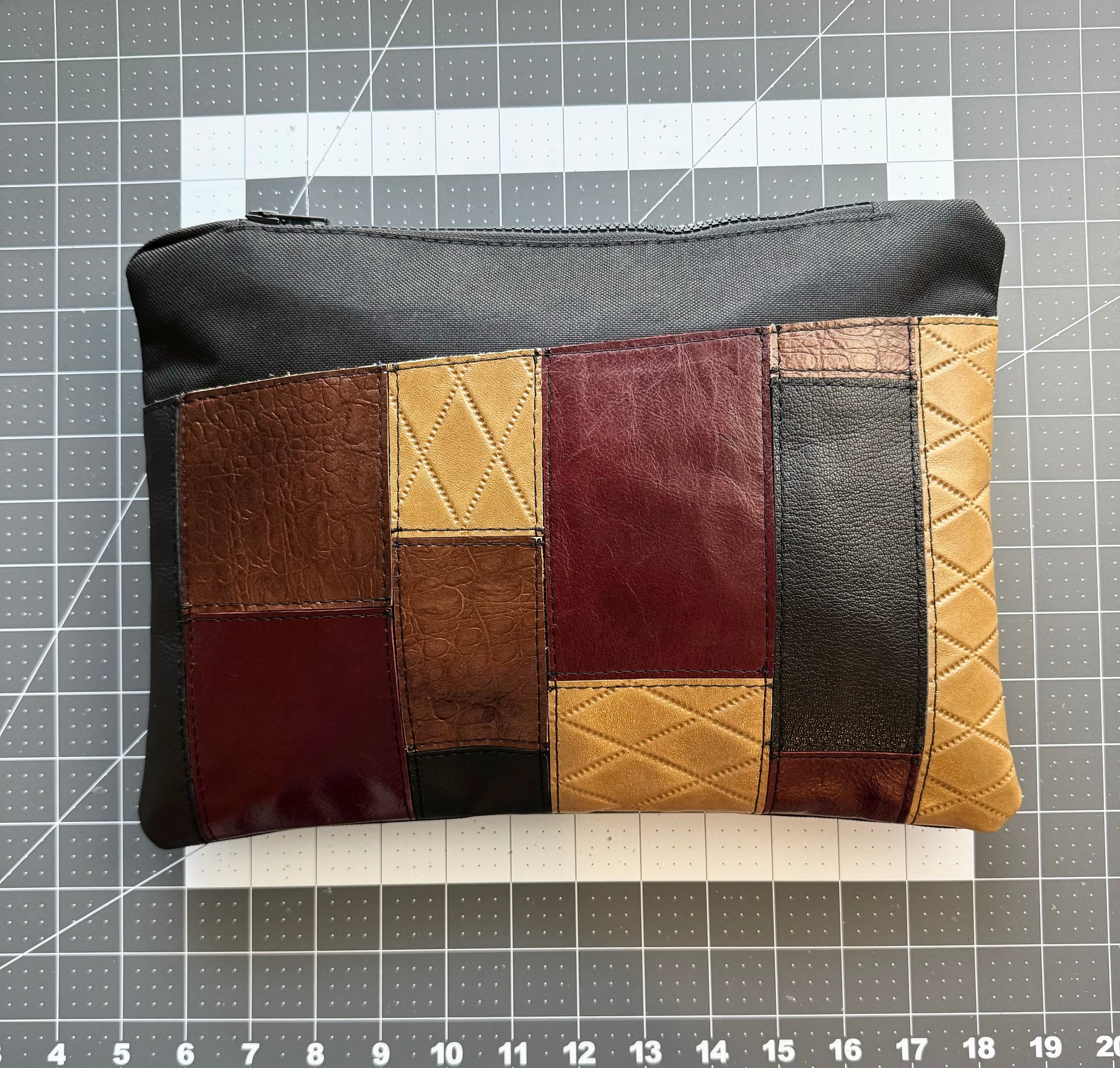 This clutch is a true work of art. It blends premium leather with stain resistant coated canvas in a vibrant design. The standout feature is its asymmetrical leather patchwork front—an unmistakable Von Perez signature that embodies individuality and craftsmanship.