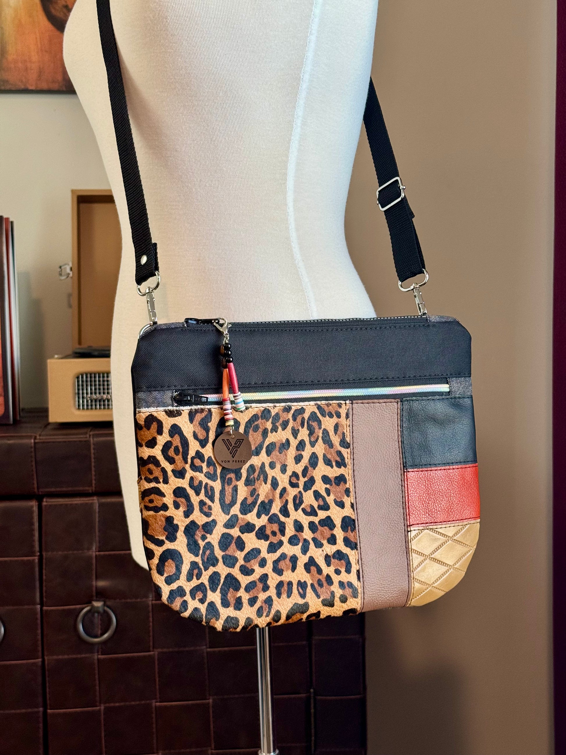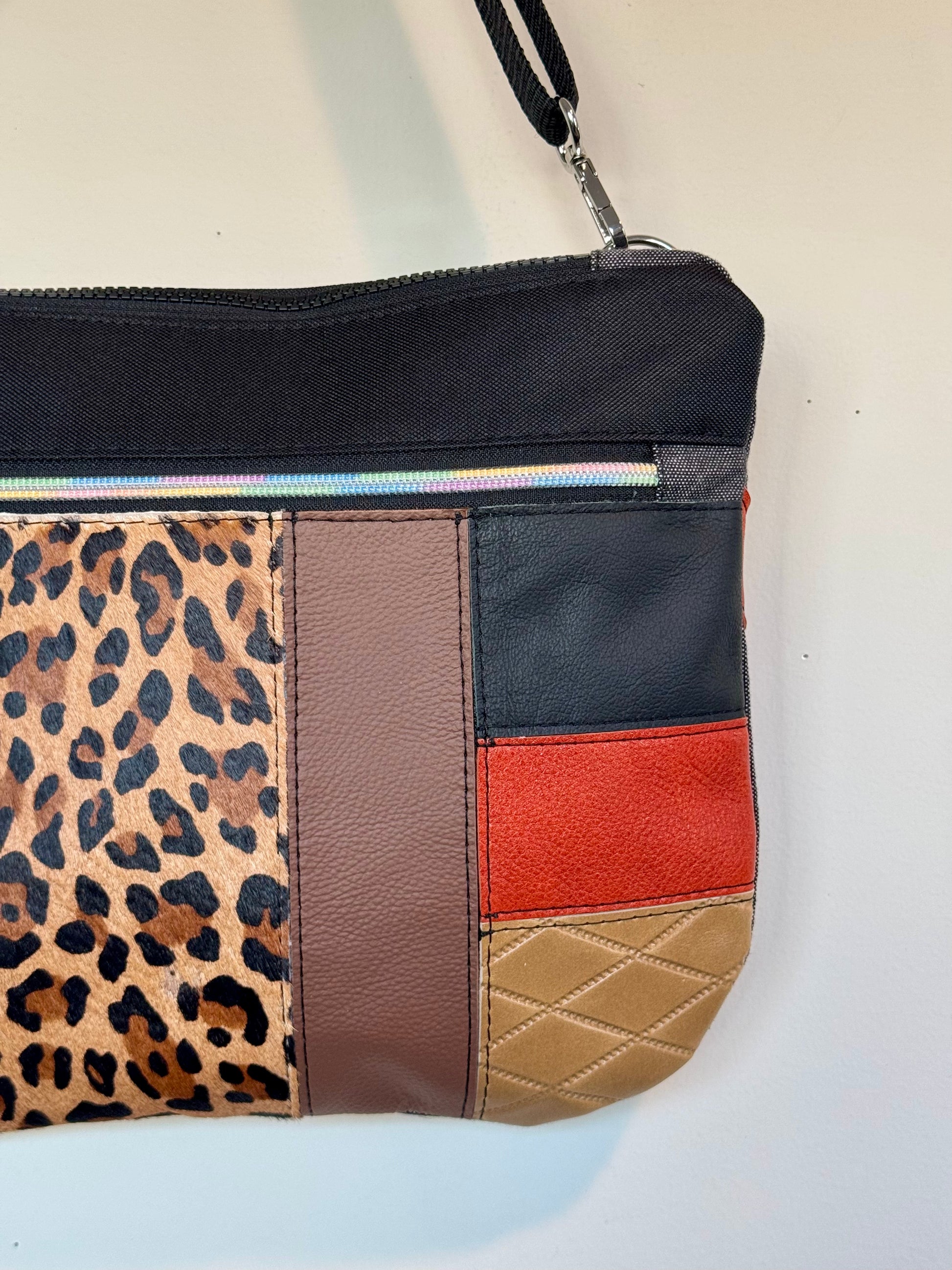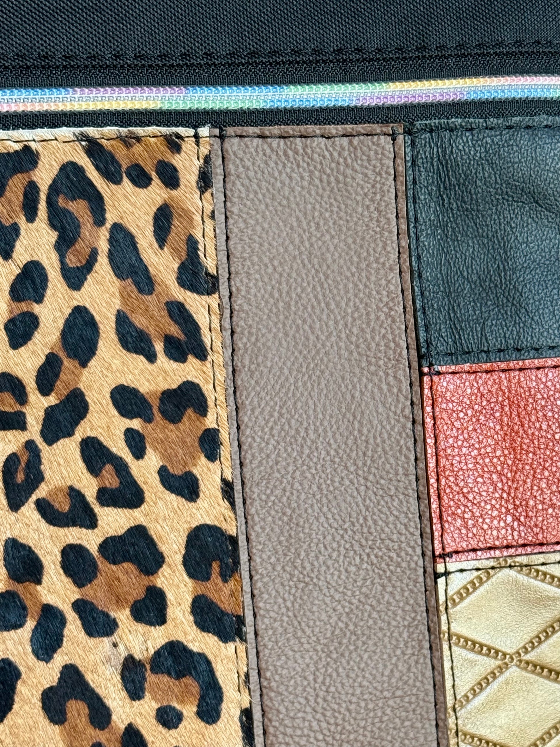 This bag was made using a mix of leather and heavy duty coated canvas. The front has hair-on leopard print cowhide, orange and black smooth cowhide, and brown embossed leather. The back is a mix of denim and coated canvas with leather accents to tie in with the front. This bag is also fully lined and comes with a removable crossbody strap allowing you to carry it across the chest, on the shoulder, or as a clutch.