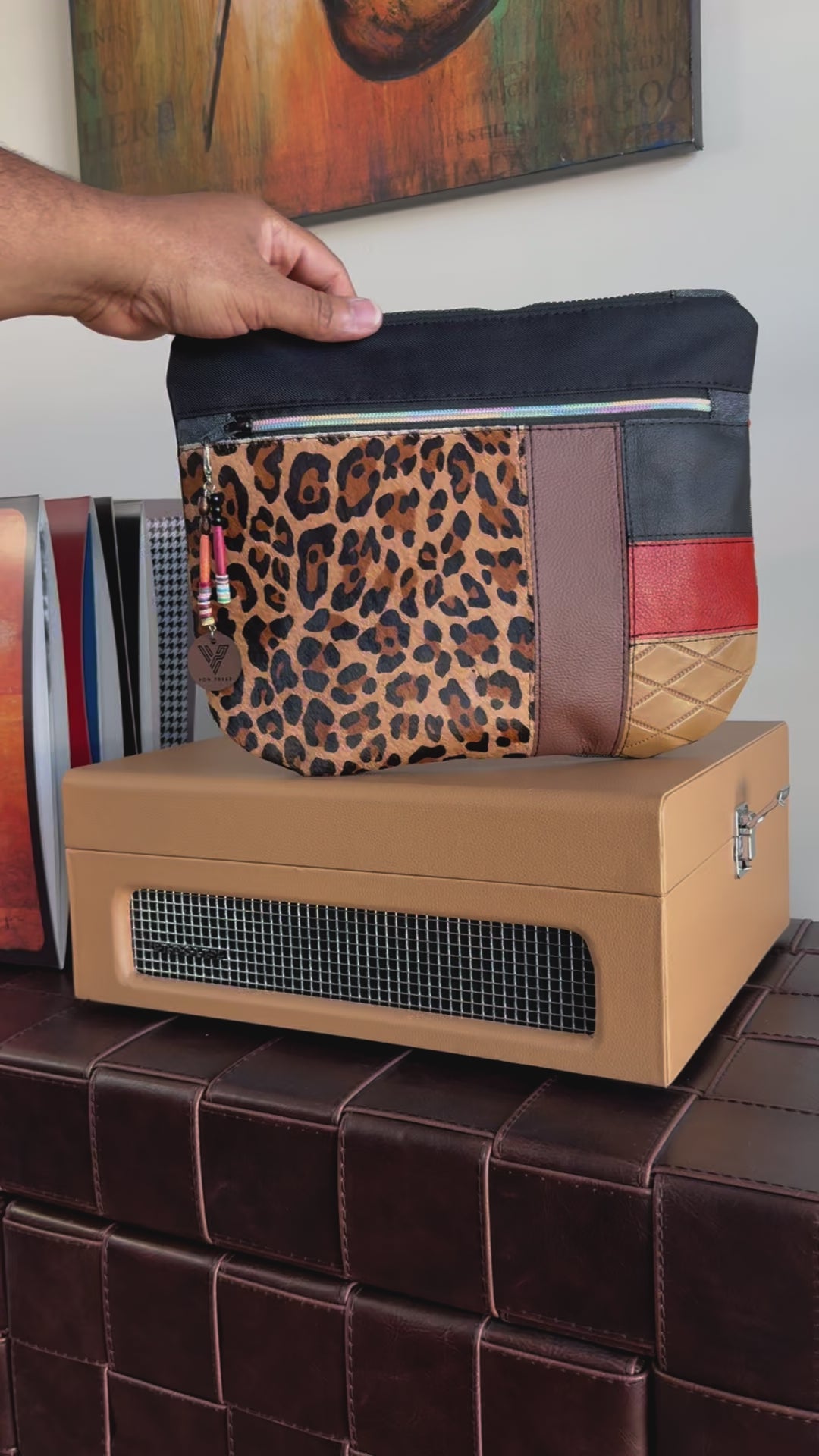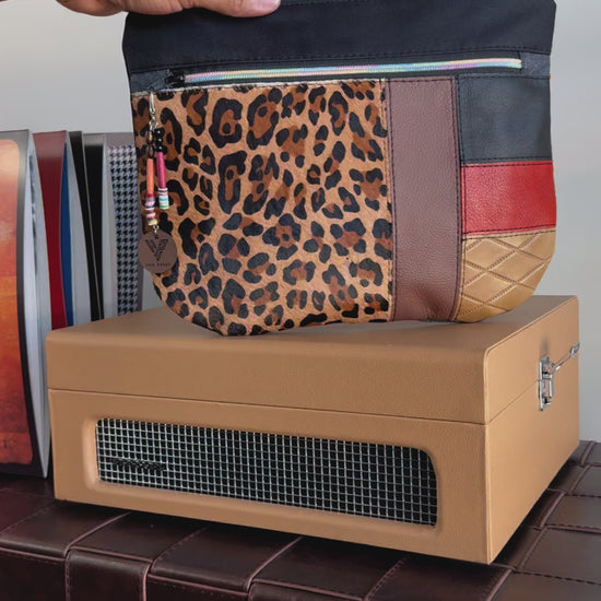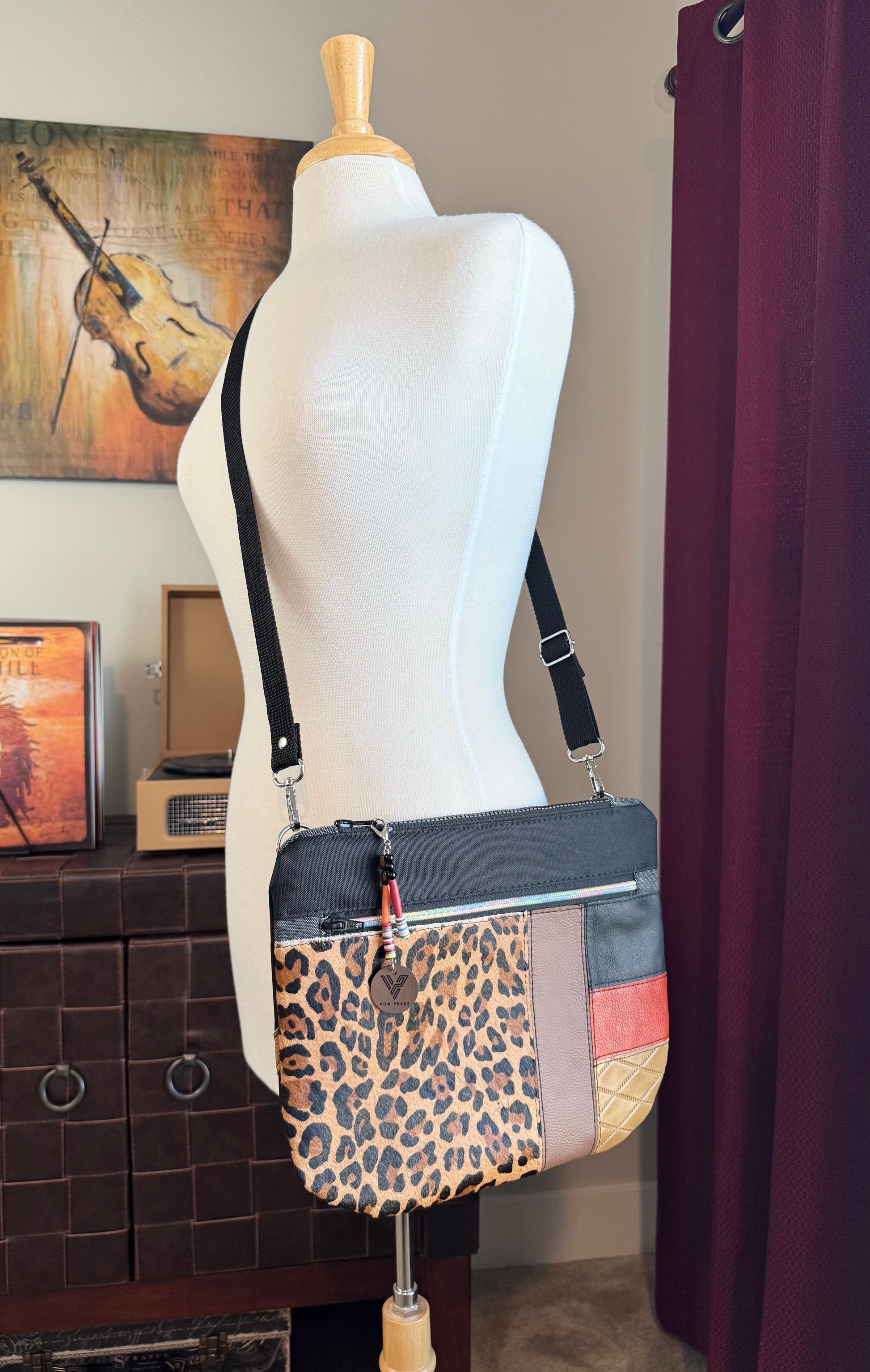 This bag was made using a mix of leather and heavy duty coated canvas. The front has hair-on leopard print cowhide, orange and black smooth cowhide, and brown embossed leather. The back is a mix of denim and coated canvas with leather accents to tie in with the front. This bag is also fully lined and comes with a removable crossbody strap allowing you to carry it across the chest, on the shoulder, or as a clutch.