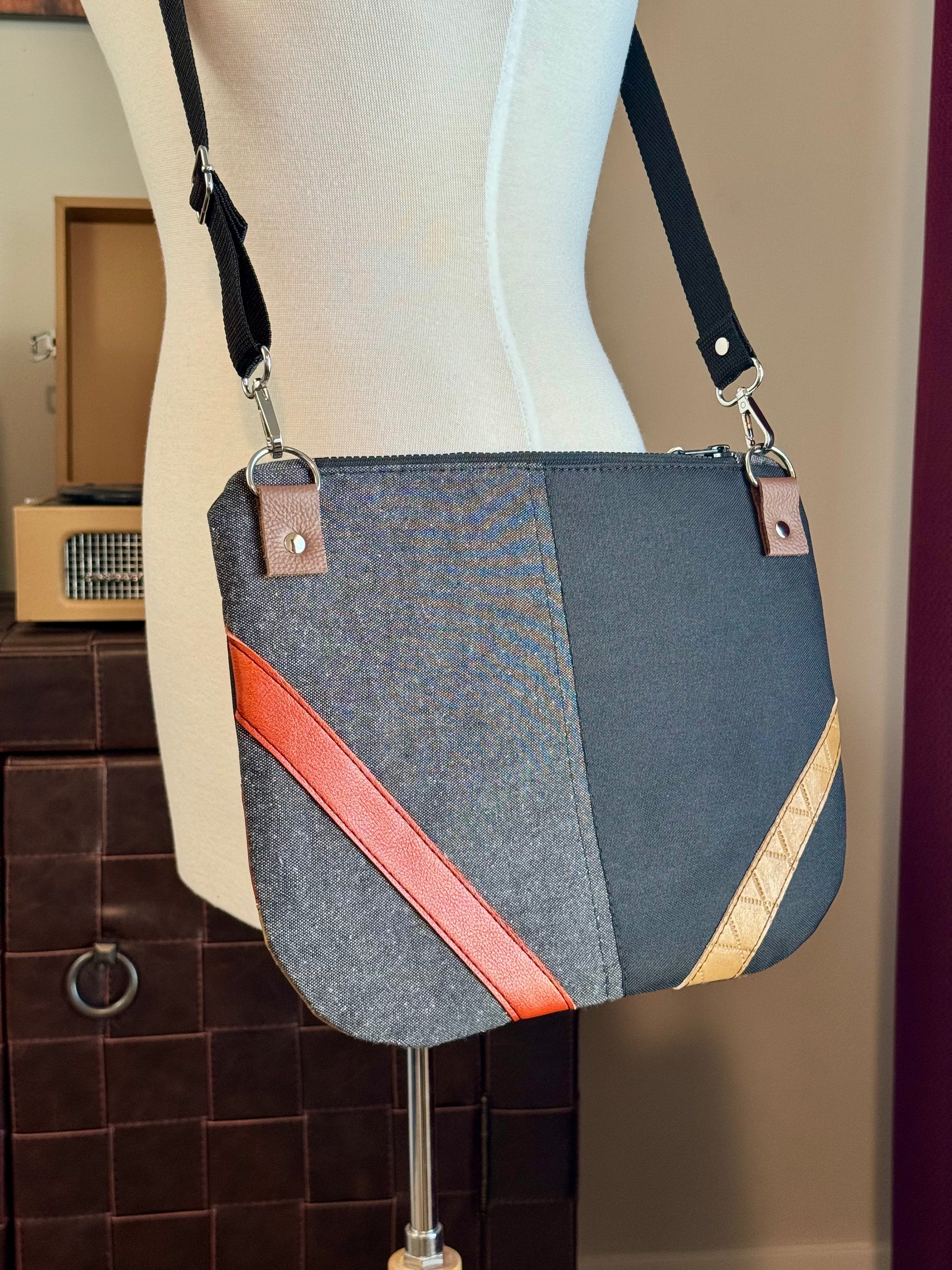 This crossbody is a true work of art. It blends premium leather with stain resistant coated canvas and denim in a vibrant patchwork design. The standout features are its leather patchwork front and unique rounded silhouette—both unmistakable Von Perez signature elements.